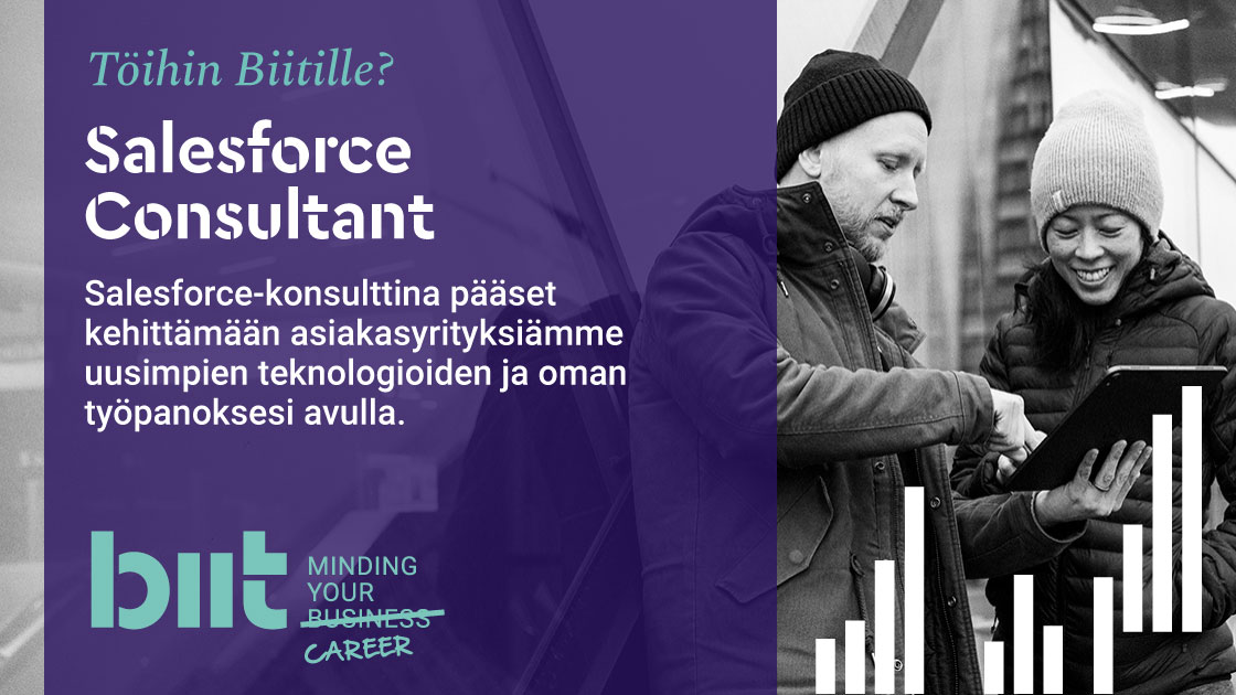 Etsimme siis liiketoiminnan ytimessä viihtyvää ihmistä osaksi kasvavaa tiimiämme. Konsultin vastuualueet meillä ovat asiakkaiden liiketoiminnan ydin-prosessien ja järjestelmien kehittäminen. Konsulttina sinun työtehtäviisi kuuluu asiakasprojekteihin liittyvät kehitys-, määrittely-, suunnittelu- ja toteutustehtävät. Biitillä työskennellessä saat kollegoiksisi Suomen parhaat Salesforce-osaajat ja pääset työskentelemään markkinoiden parhaan teknologian parissa. Meillä pääset kehittämään yritysten kasvua sekä kilpailukykyä uusimpien teknologioiden ja oman työpanoksesi avulla.