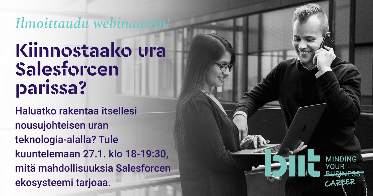 Ilmoittautuminen webinaariin on nyt avoinna. Mukaan pääsee tämän linkin kautta: https://www2.biit.fi/ura-Salesforcen-parissa